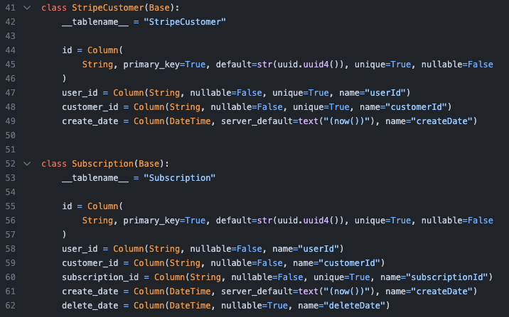 我们复制粘贴了它生成的代码,发现一切运行良好;之后又在生产中进行测试,结果也同样有效。于是我们兴高采烈地推进,却忘记了此时我们仍在使用 next api 进行数据库插入,且 python 代码只负责从数据库中读取。我们第一次开始在 python 中实际插入数据库记录是在订阅功能的实现阶段,虽然我们为此手动创建了全新的 sqlalchemy 模型,但最终却仍然照搬了 chatgpt 为原有模型编写的旧格式代码。当时的我们根本没意识到,所有模型当中的 id 生成方式都已经出了问题。
