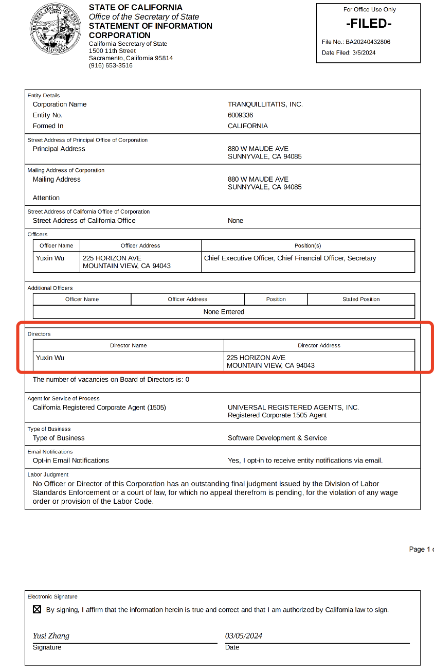 ohai 和 noisee 的网站显示,这两款产品均属于一家位于加州桑尼维尔的公司 tranquillitatis。tranquillitatis 在加州的注册文件显示,该公司的唯一董事是 yuxin wu,这与月之暗面联合创始人之一的吴育昕名字相同。